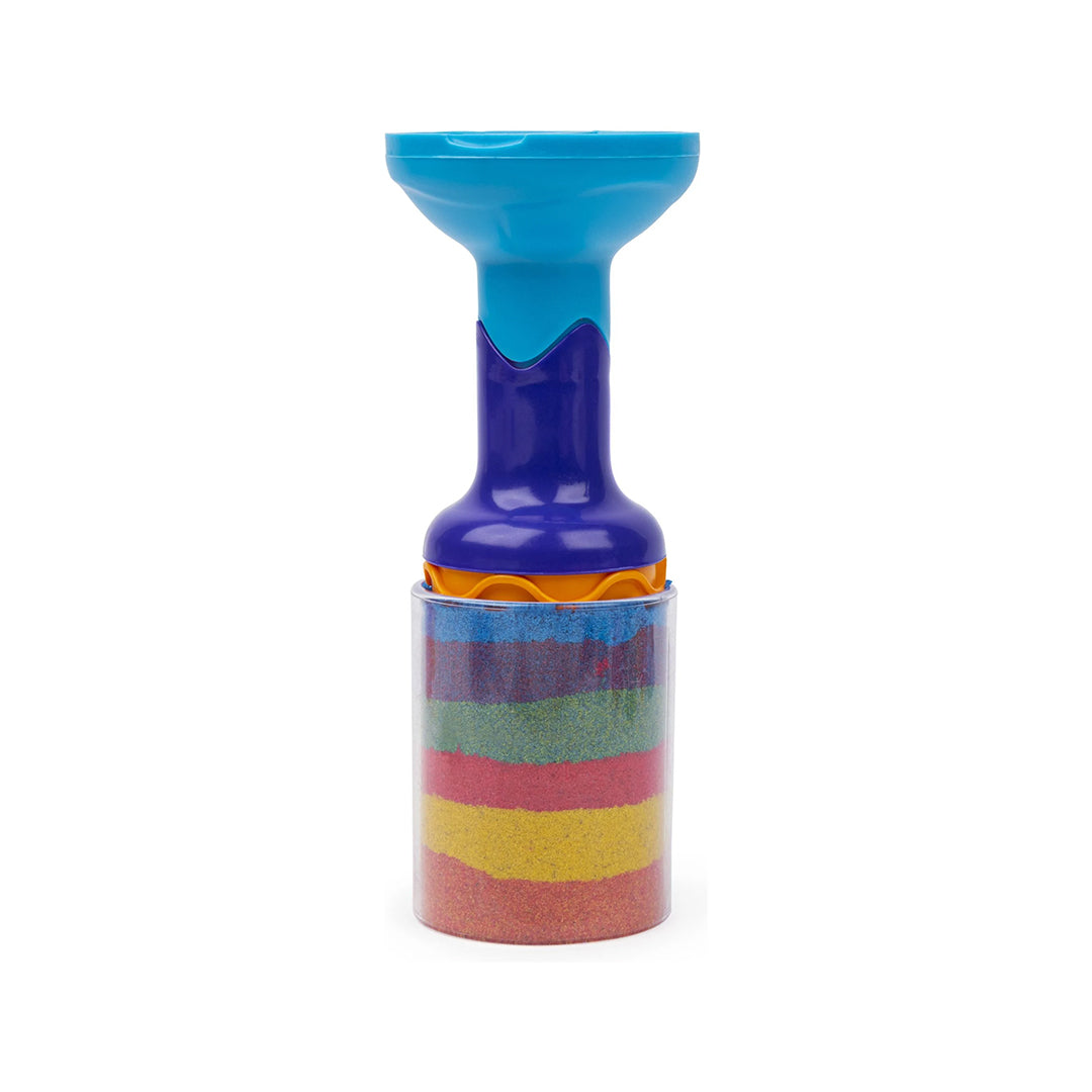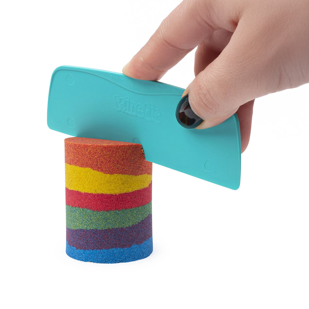 Create mesmerizing rainbow effects with the Kinetic Sand Rainbow Mix Set! This set includes everything you need to mix and create the colours of the rainbow! With six different tools and three primary colours of Kinetic Sand (4.5oz each of red, yellow and blue) in Castle Containers, there are so many ways to create! Kinetic Sand is the original mesmerizing sand that flows through your hands and never dries out, so you can play again and again. Create perfectly-sized portions of Kinetic Sand to help you easily mix together the colours of the rainbow! Snap on one of the three stamps to the squisher tool, layer your sand segments into the stacker mold any way you want, and press down. Remove your creation from the mold to reveal your surprise patterned creation! Slice and dice with the kid-friendly slicer; mix your rainbow creation together; mold colourful castles and create again and again! Let Kinetic Sand flow through your hands – it’s so satisfying, you won’t be able to put it down! Film your sandisfying rainbow creations and create your own videos to share. Create surprise rainbow creations every time with the Kinetic Sand Rainbow Mix Set!