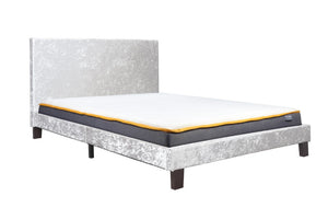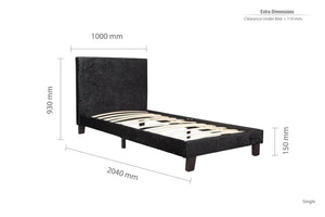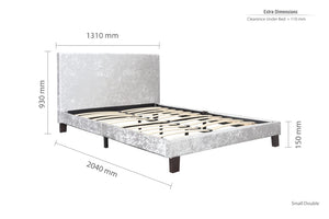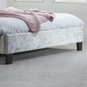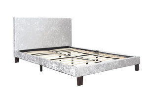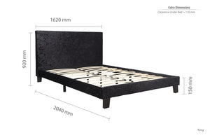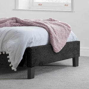 - This bed frame is upholstered in either grey fabric, steel or black crushed velvet