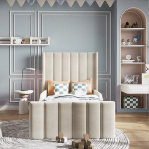 The Lined Wingback Kids Bed is a stylish and comfortable bed designed for children. Featuring a wingback headboard with elegant lining, this bed adds a touch of sophistication to any child's bedroom. The bed is made with sturdy materials and is built to last, providing a safe and secure sleeping environment for your child. With its classic design and high-quality construction, the Lined Wingback Kids Bed is sure to become a favourite piece of furniture in your home. Please note that feet are not provided as they are an optional accessory.