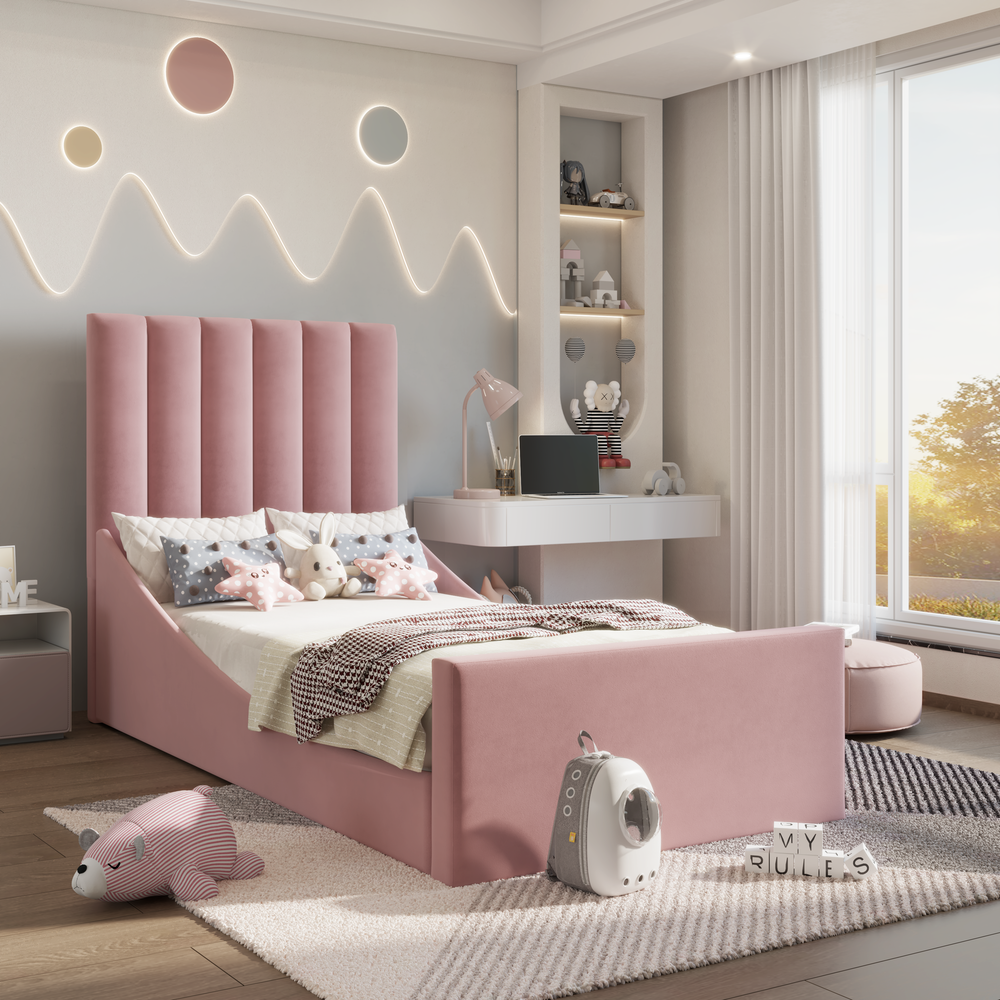 The Prestige Lined Kids Bed is the optimal option for an elegant and cosy sleeping area. Available in 12 velvet fabric colours, this bed frame is handmade with a sturdy internal frame and a wooden slatted base. Furthermore, the option to upgrade to an ottoman storage bed for extra storage exists. There is option to choose safety side rails. This bed is designed with comfort, practicality, and safety in mind. It is the perfect choice for busy households and children's bedrooms, offering smooth edges, quality construction, and the versatility to meet all your needs.