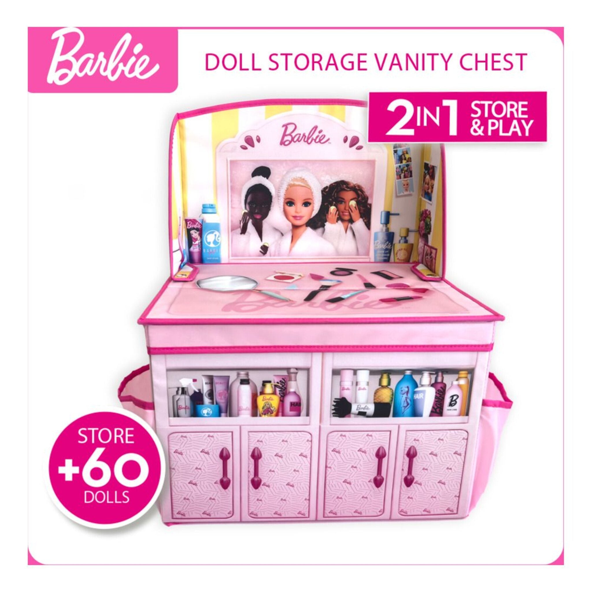 Bring Barbie’s world of glam into your child’s room with the Barbie Doll Storage Vanity Chest – a stylish 2-in-1 solution for play and organization! This versatile chest easily transforms from a spacious toy organizer into a fun vanity playset. With room to store over 60 Barbie dolls and accessories, plus four functional side pockets, it keeps everything tidy while inspiring hours of imaginative play. Perfect for styling dolls, organizing outfits, or tidying up, this foldable vanity adds a magical touch to any playroom.