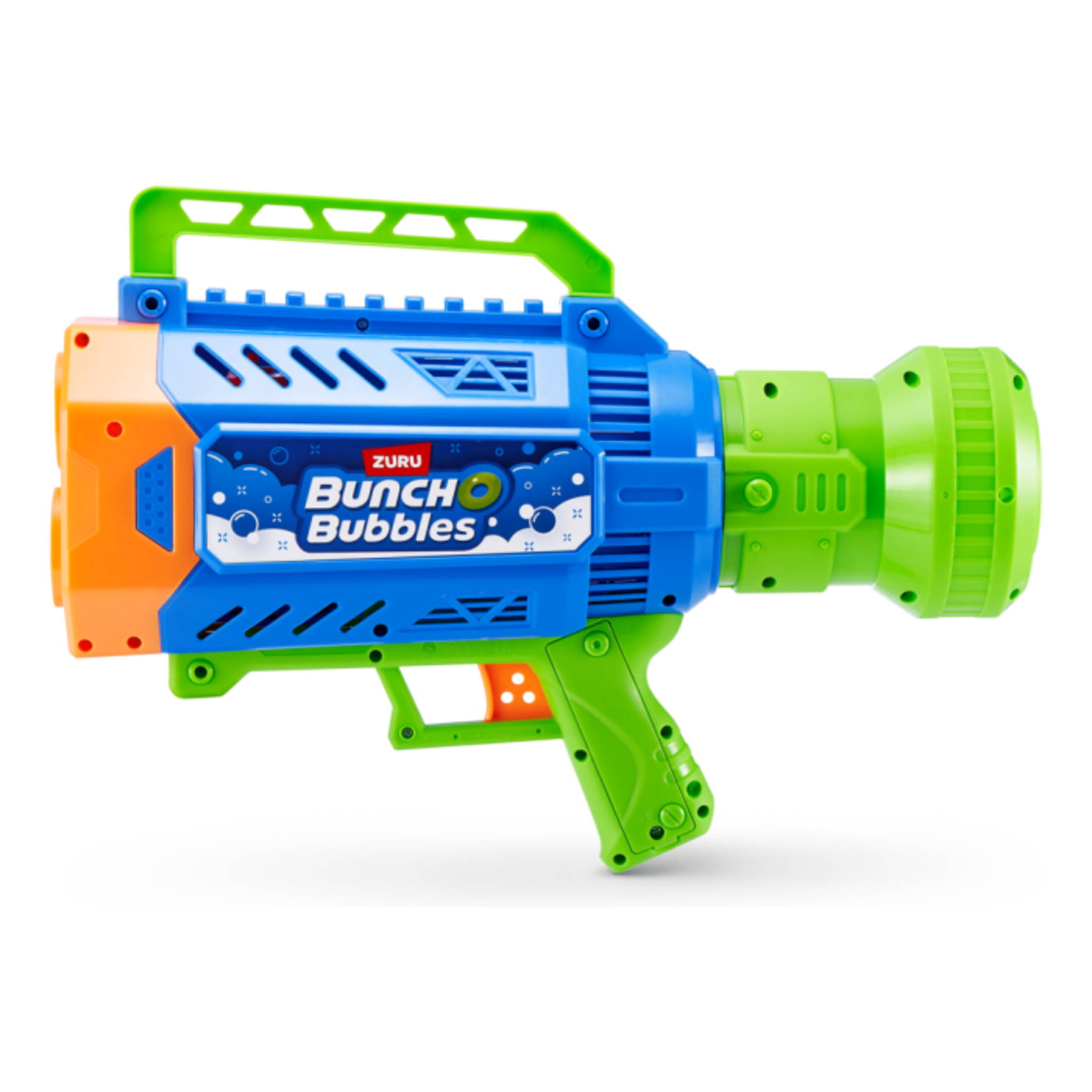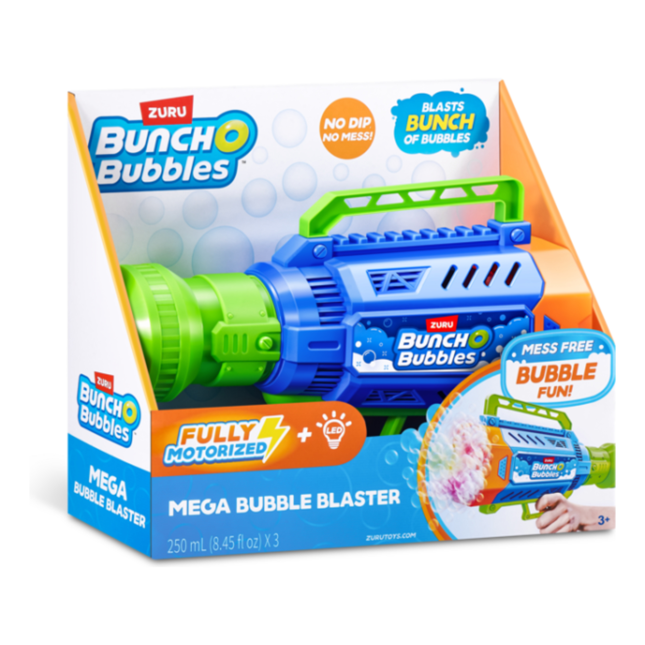 Blast millions of bubbles with the Bunch O Bubbles Motorized Mega Bubble Blaster! This no-dip, no-mess bubble blaster takes the fuss out of bubble fun—simply place the included bubble solution into the easy refill holder for a continuous flow of bubbles.