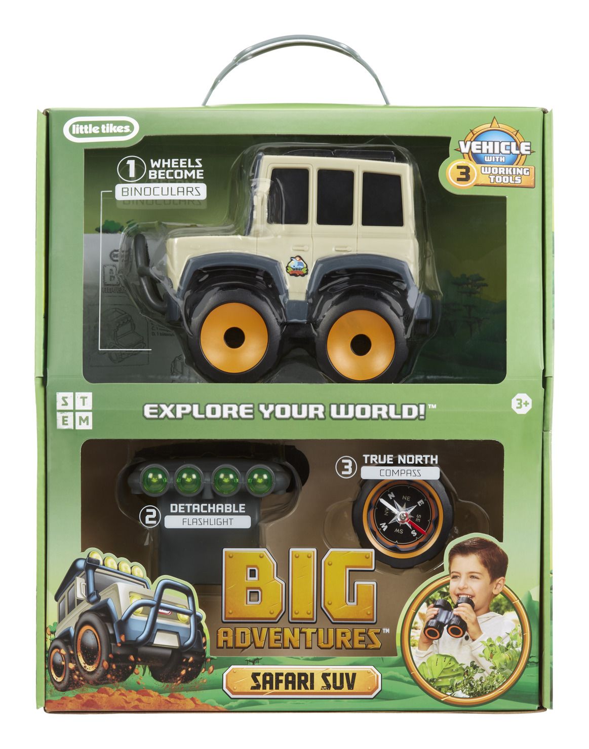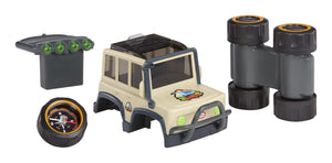 The Safari SUV features three detachable tools: binoculars, a flashlight, and a compass. The spinning wheels transform into binoculars with 3x magnification, the headlights become a working flashlight, and the back tyre functions as a true north compass. Perfect for curious boys and girls ages 3 and up, this toy inspires exploration, learning, and outdoor fun!