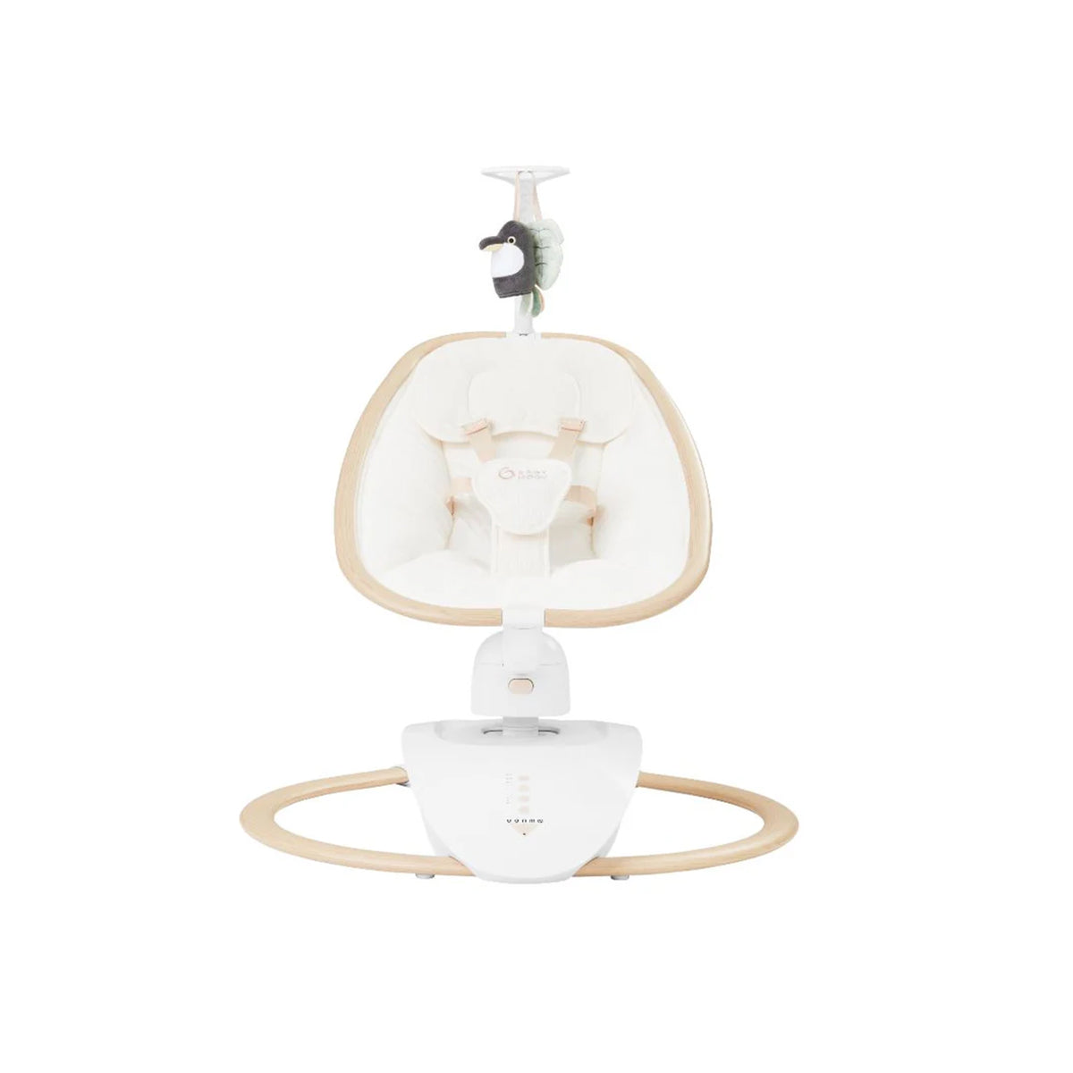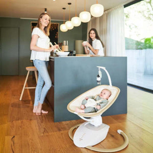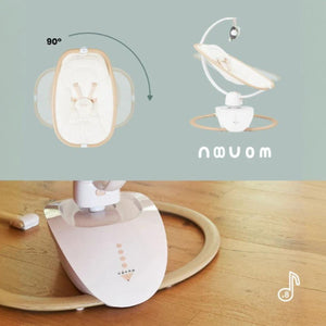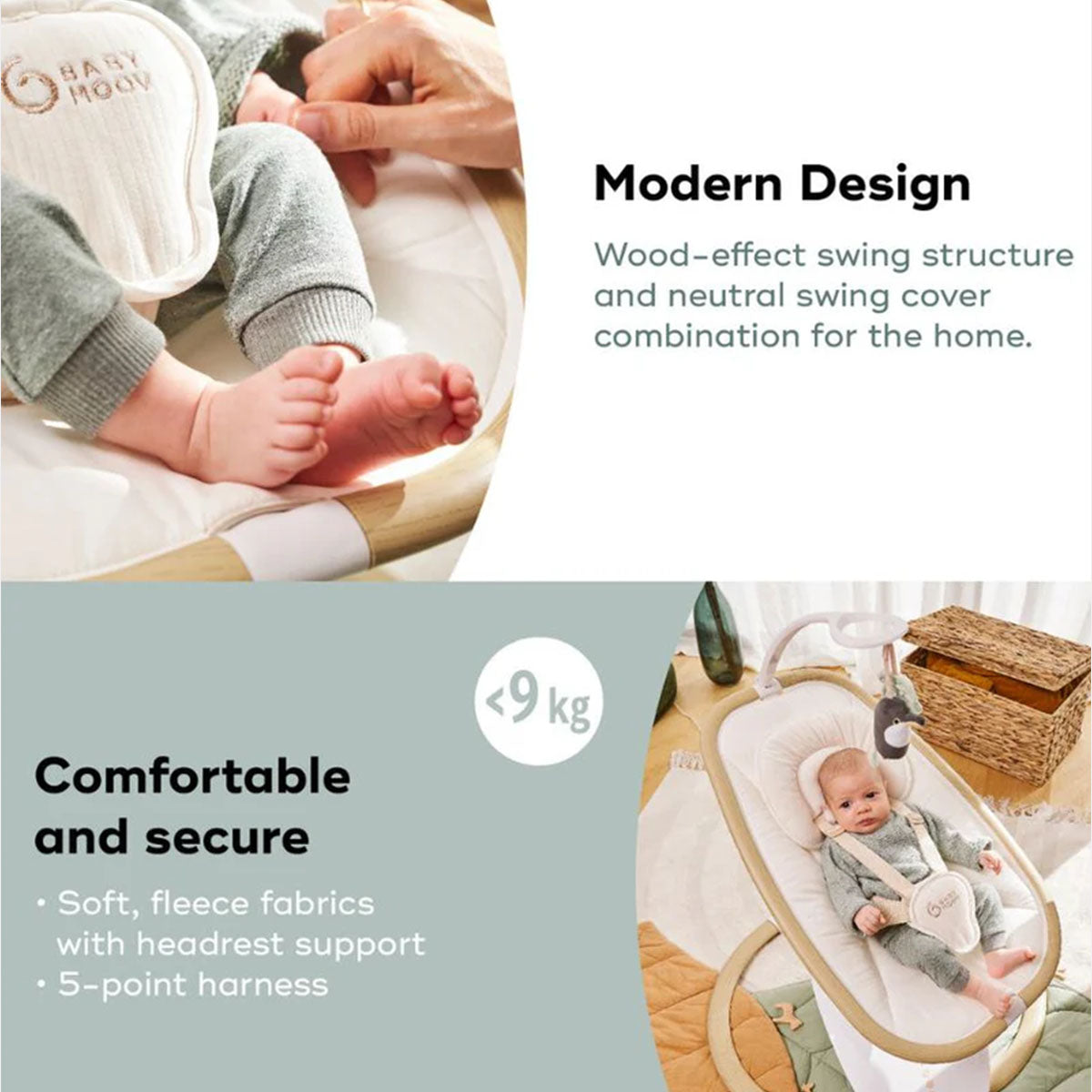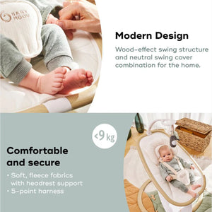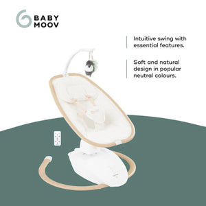 The Babymoov Swoon Hoop is a stylish and comfortable baby swing with a natural wood-effect design. It offers five swing motions, a 90° swivel seat, eight lullabies, and a tilting seat with two positions. The swing also includes a remote control for easy operation.