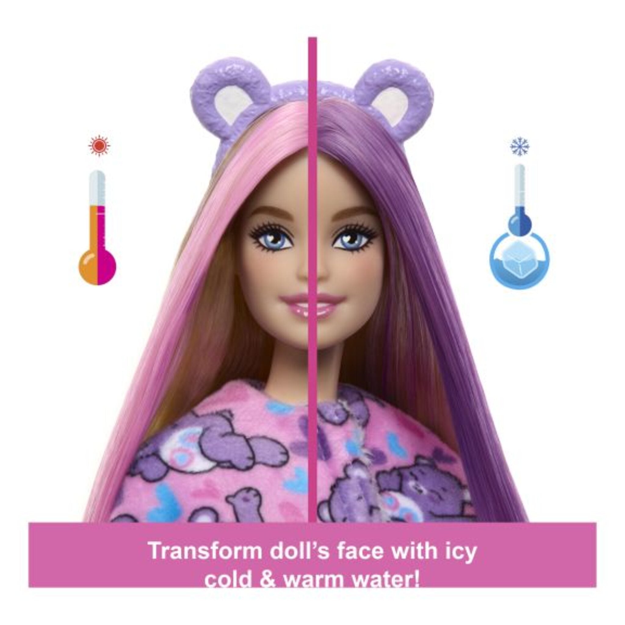 Experience the cutest unboxing with Barbie Cutie Reveal Care Bears dolls, featuring 10 exciting surprises! This edition reveals Share Bear hidden inside a plush costume with a winking face and heart lollipop graphic. Lift the plush head to reveal a posable Barbie doll with long blonde hair streaked with purple, and discover fashions, accessories, and a matching mini Share Bear. Add water for magical colour-change fun and repeat the transformation over and over. Perfect for children aged 3–7 years.