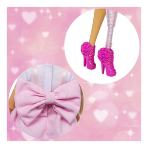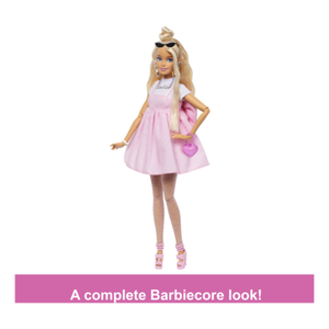 Step into the world of Barbiecore glam with the Barbie Deluxe Style – Bow doll! Decked out in signature pink, she wears a pastel babydoll dress layered over a white tee, complete with an oversized back bow and pink mesh tights. Her wavy blonde hair is styled in a chic half-up top knot, while statement jewelry, pearly sunglasses, a heart-shaped purse, and strappy bow shoes complete the look. Bendable joints let kids and collectors pose her in all sorts of runway-ready stances.