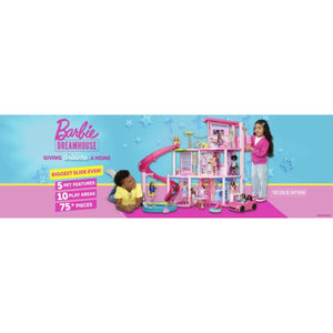 Kids can host the ultimate pool party with the Barbie Dreamhouse! This deluxe dollhouse features the tallest slide in Barbie Dreamhouse history—a three-story spiral design for endless fun in the sun. With a 360-degree play design, three levels, and 10 indoor and outdoor living areas, kids can explore every corner of Barbie’s world. The Dreamhouse includes pet-friendly touches, like a puppy slide, pool, and pet elevator, so furry friends can join in the adventures. The top-floor bonus room transforms for sleepovers, allowing four dolls to spend the night. With 75+ accessories and customizable spaces, this set is a gift packed with imaginative storytelling for kids 3 years and up. Assembly required. Dolls not included. Colors and decorations may vary.