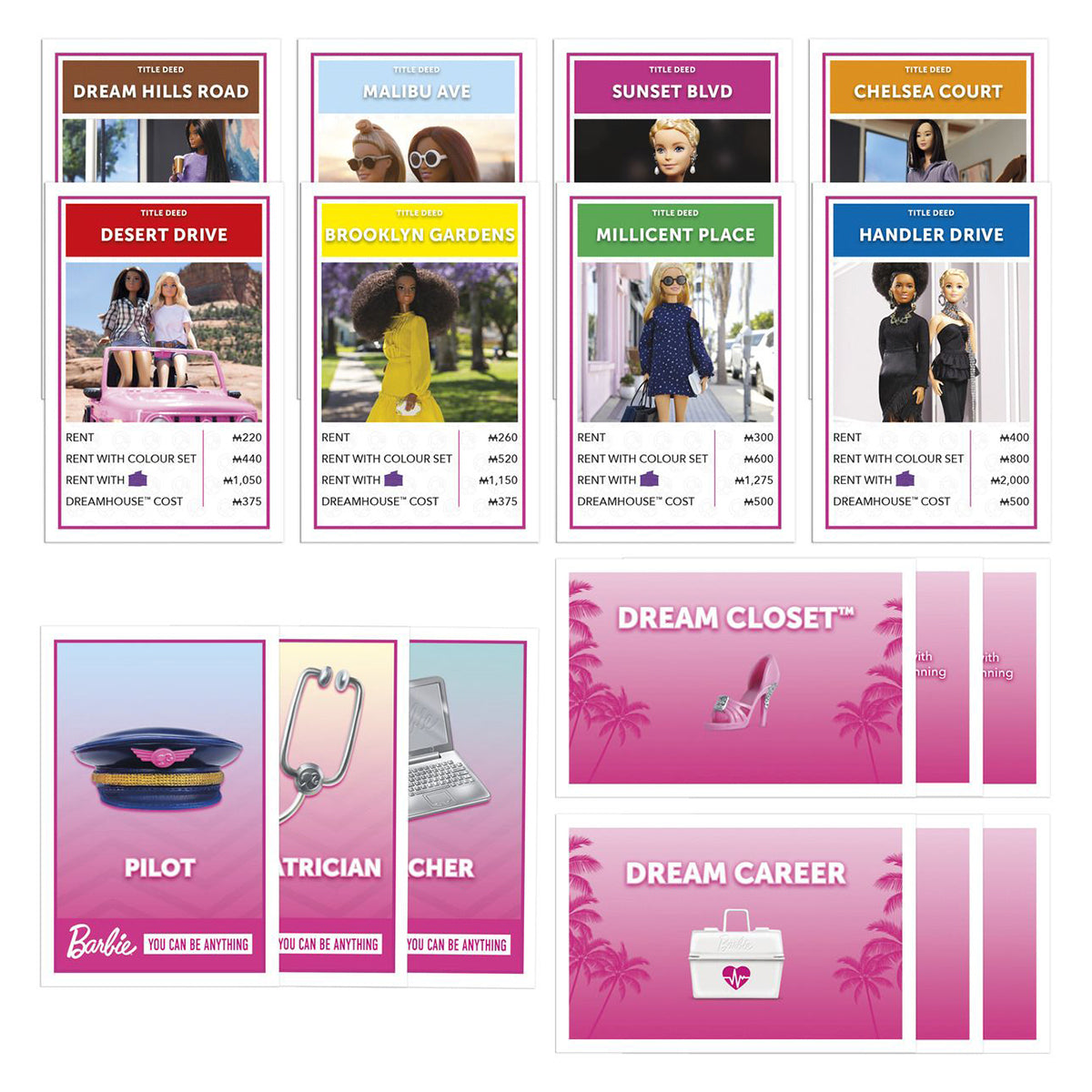 Be anything with Barbie! With the Monopoly: Barbie Edition board game, players can imagine slipping into pink Barbie shoes as they follow their dreams to own it all! First, each player selects a Be Anything card to choose from 6 Barbie careers.