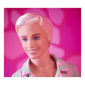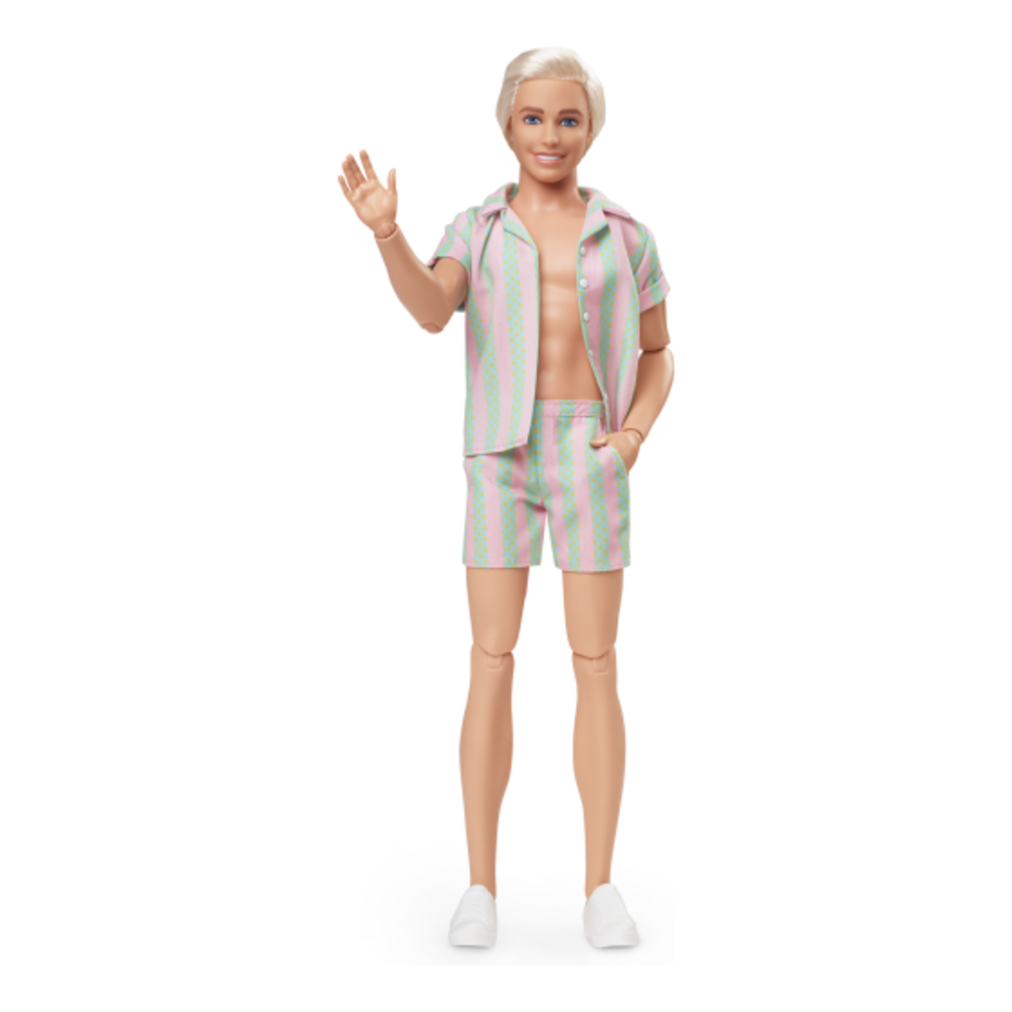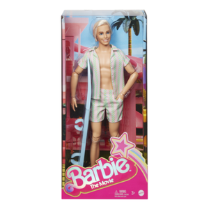 Catch the vibes of Barbie Land with this stylish Ken® doll, inspired by his character in Barbie The Movie! Dressed in a pastel pink and mint green striped top with matching shorts featuring working pockets, Ken looks ready for the ultimate beach day. Accessories include a surfboard, white sneakers, and his signature platinum blond hair styled for the sun. Posable and displayable, this doll is perfect for imaginative play or collector display. Doll cannot stand alone. Colors and decorations may vary.