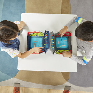 Players command a powerful fleet that includes an aircraft carrier, a destroyer, a submarine, a patrol boat, and a battleship. Each player announces the coordinates of each strike and sees if it hits. Position ships strategically to survive an opponent's relentless strikes, and track hits and misses with red and white pegs on the ocean grid. No ship is safe in this game of stealth and suspense. It's a fun indoor activity for kids ages 7 and up, and it's easy to pack up and take on the go.