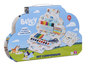 Have lots of creative fun with the Bluey Art Compendium, contains a host of art supplies and stationery. Everything stores inside the lovely cloud shaped carry case with handle, which features authentic Bluey styling. Perfect for encouraging creative play. Product features: Children will love using their Art kit to create their own Bluey masterpieces Your little pup will love this Bluey themed carry case complete with Bluey Branded stationary inside.