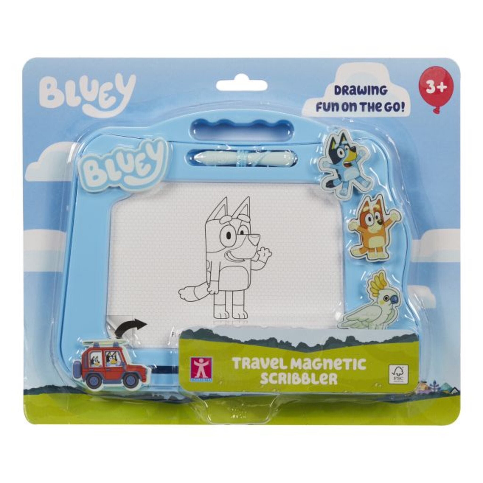 Let your little one enjoy hours of creative fun with the Bluey Travel Magnetic Scribbler! This lightweight, mess-free drawing tablet allows children to draw, erase, and start again — perfect for on-the-go entertainment. Bring Bluey and friends to life with the included magnetic pen and three fun-shaped stamps. Ideal for travel, long journeys, or quiet play at home, this portable drawing tablet encourages creativity without any mess.