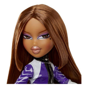 Get ready for fashion in the fast lane! Bratz is back with Scorchin’ styles that are race-day ready and full of attitude. Yasmin is dressed in a purple racing jacket paired with a matching leather frilled mini skirt, giving her a chic, moto-inspired look. She completes her outfit with platform boots featuring a lipstick-shaped heel and stylish sunglasses. Her soft-glam makeup and long, blunt-cut hairstyle make her runway-ready for any high-speed adventure.