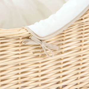 - Comes with a naturally varnished wicker Moses basket, thick padded organic dressing, cream sheet and a firm natural bamboo mattress.