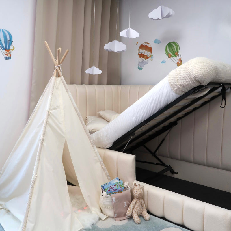 Make your child's bedtime stories come alive with the Day Bed With Storage 3 in 1. Handcrafted with the highest quality materials, this impressive bed features a luxurious line headboard. Built to last by skilled craftsmen, it is customisable to any fabric and colour you choose. Rest assured your little one is soundly tucked in a bed that offers strength and comfort.