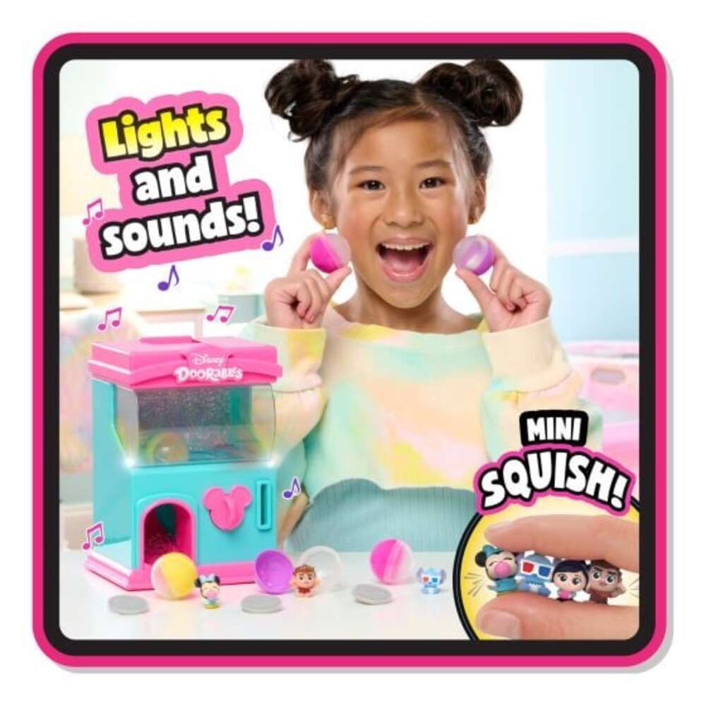 Discover tiny squishy surprises with the Disney Doorables Squish’alots Squish Machine! This adorable 16-piece coin-operated toy vending machine includes 6 mystery capsules containing exclusive Squish’alots characters. Insert a special coin, twist the knob, and hear fun lights and sounds as a capsule dispenses. Open it to reveal a squishable mystery friend! Each figure stands approximately 1 inch tall and features Doorables’ signature stylized detailing with sparkly glitter eyes. The Squish Machine can be reused to store, display, and dispense capsules again and again. Collect additional Doorables Squish’alots figures to multiply the squeezable fun. Ideal for fans of Disney toys, collectors, and kids ages 5 years and up.