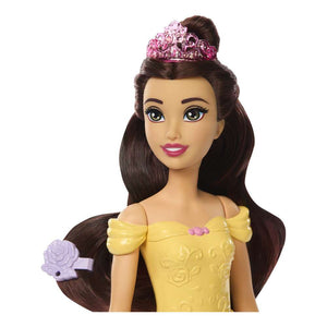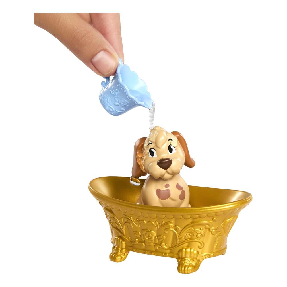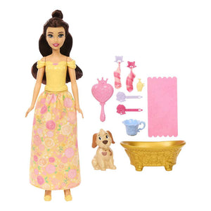 Disney Princess Belle is ready to bathe and brush her sweet dog in style! Inspired by the animated characters in Disney's Beauty & the Beast movie, this set includes a Belle fashion doll in her signature color and a sweet dog figure in need of a bath! With a bathtub, towel and warm water, kids can 'clean' the dog through color-change magic then style the pretty pup with the included brush, hair extensions and barrettes. Now Belle and her dog are ready for the day's adventures! Doll cannot stand alone. Colors and decorations may vary.