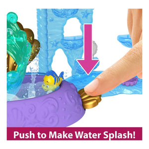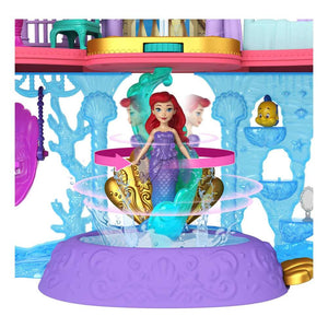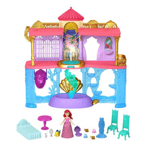 Ariel's land and sea kingdoms will delight fans in this playset, inspired by Disney's The Little Mermaid! A stackable doll house in charming small scale, the top of Ariel's castle is the world above the water and the bottom is the world below the waves. It comes with furniture, play pieces, a Flounder figure, and an Ariel doll with 2 fashions. Doll cannot stand alone. Colours and decorations may vary.