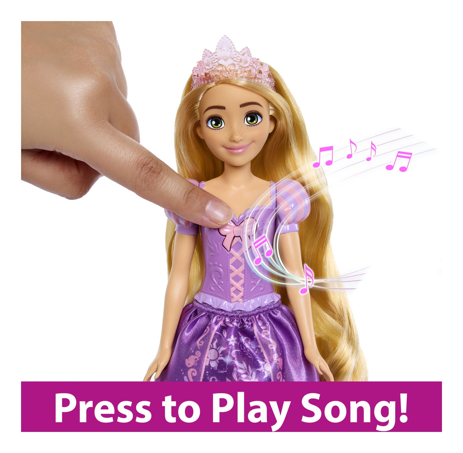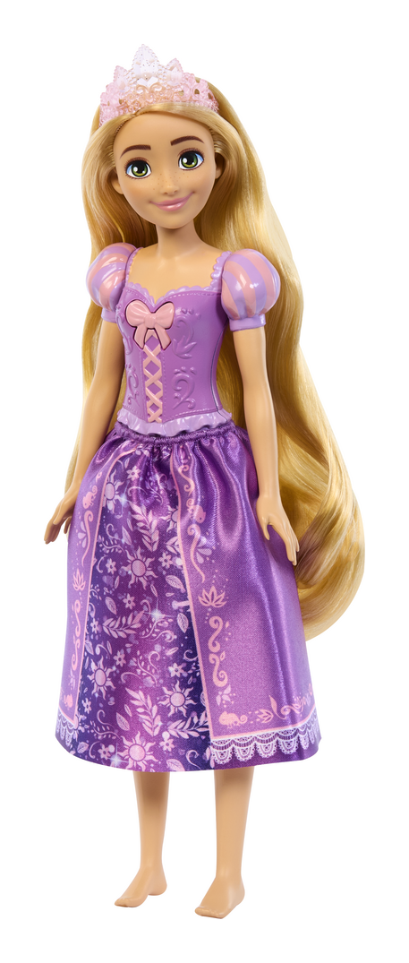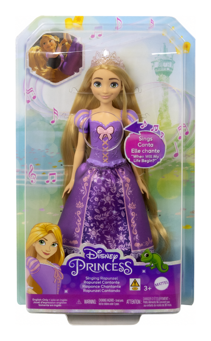 Inspired by the animated character from Disney's Tangled, this vibrant and creative Rapunzel doll is ready for adventure! Fans will love to join in as Rapunzel doll sings her signature song 'When Will My Life Begin?' Wearing her classic purple outfit, this Rapunzel doll sings with one press of a button. Kids can re-create their favourite movie moments or make up their own Rapunzel stories. Doll cannot stand alone. Colors and decorations may vary.