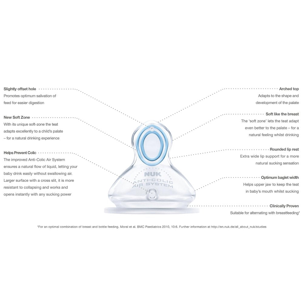 - Modelled on the shape of a mother's nipple during breastfeeding, NUK teats encourage latch on