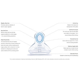 - Orthodontic shaped teat with a special, super soft zone adapts ideally to baby's palate