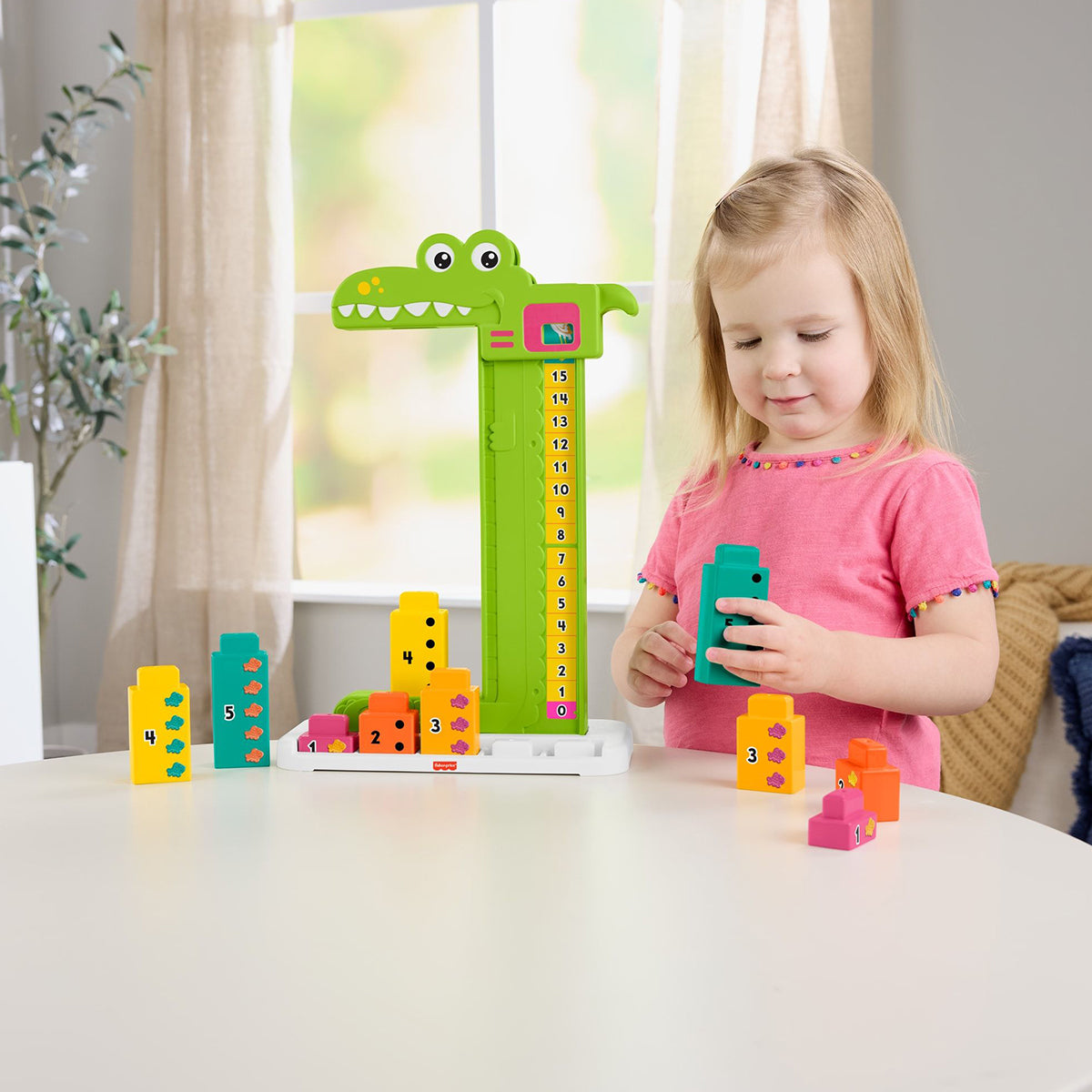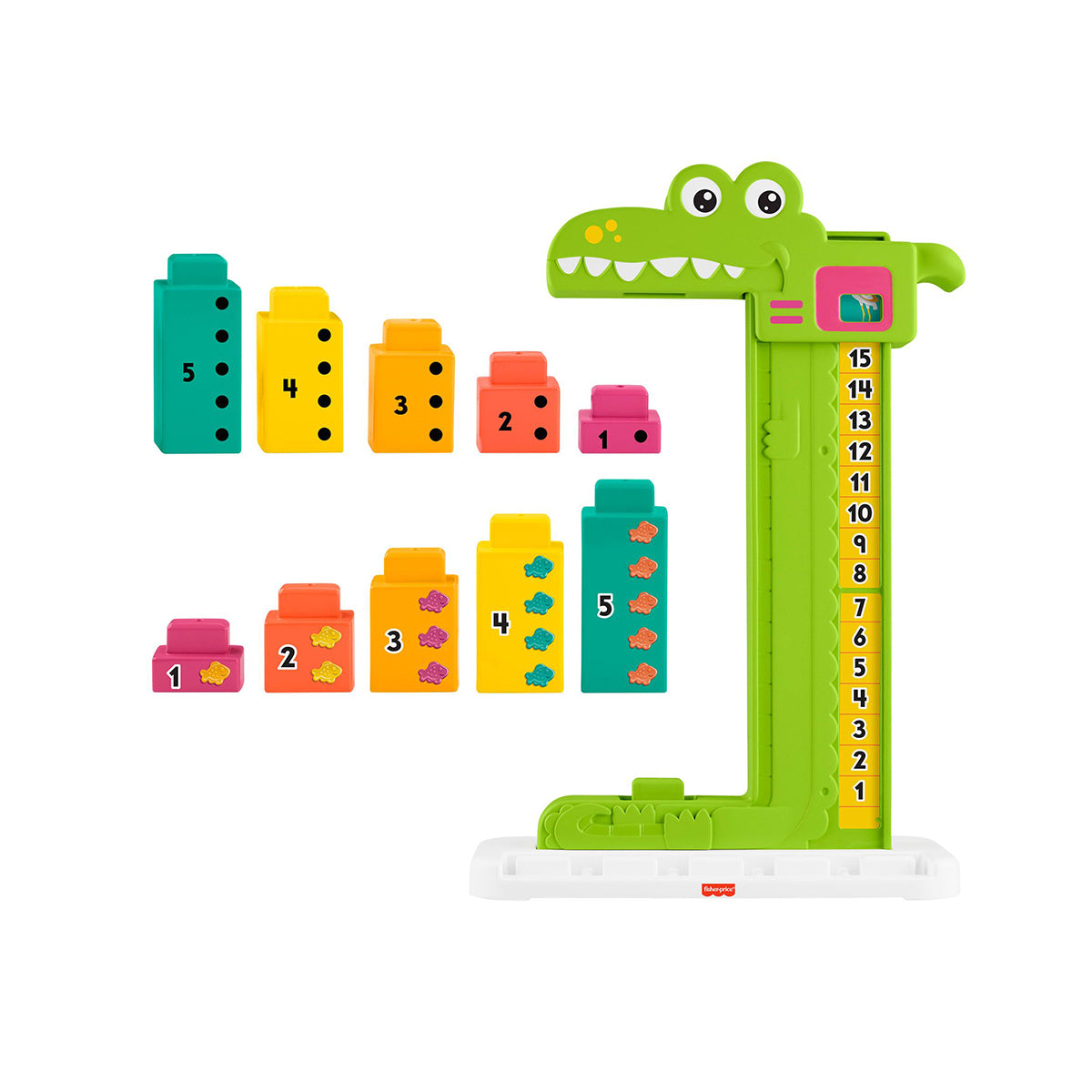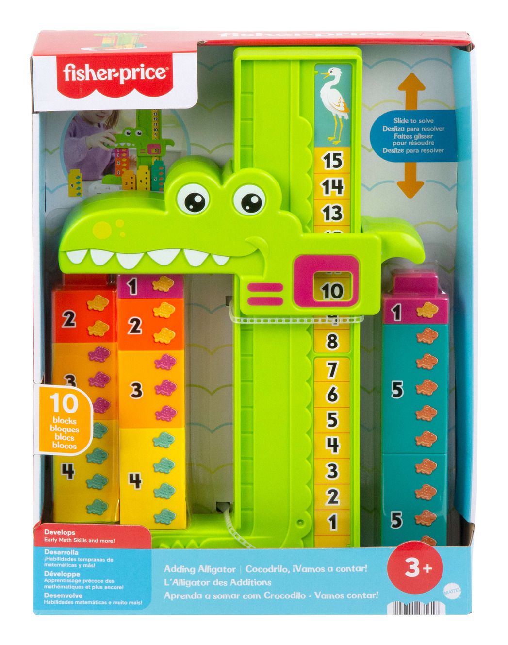 Preschoolers can count on fun with the Adding Alligator learning toy from Fisher-Price. Designed to introduce numbers and early math concepts using blocks and stacking play, kids can explore adding and subtracting by stacking the numbered blocks up to “feed” the alligator. When they slide the alligator’s head down, it stops on the top block and the correct sum of the numbers is revealed! Kids can try adding different number combinations, or they can remove blocks to see how subtraction works. Blocks stack on the base for easy storage. Colors and decorations may vary.