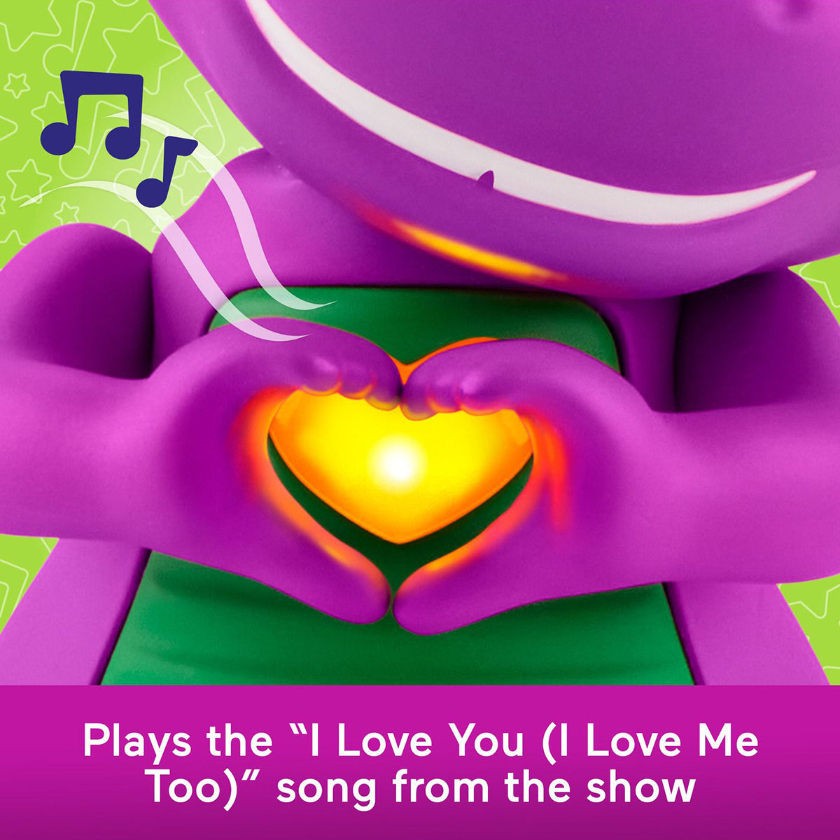 Inspired by the Barneys World series, this musical Barney toy recreates the characters cute heart hands pose with fun phrases. When kids press the figures belly, Heart Hands Barney tilts his head as the dinosaur pops up his hands to frame his light-up heart. Featuring 15+ songs, sounds & phrases, including the fan-favorite I Love You (I Love Me Too) song from the series.
