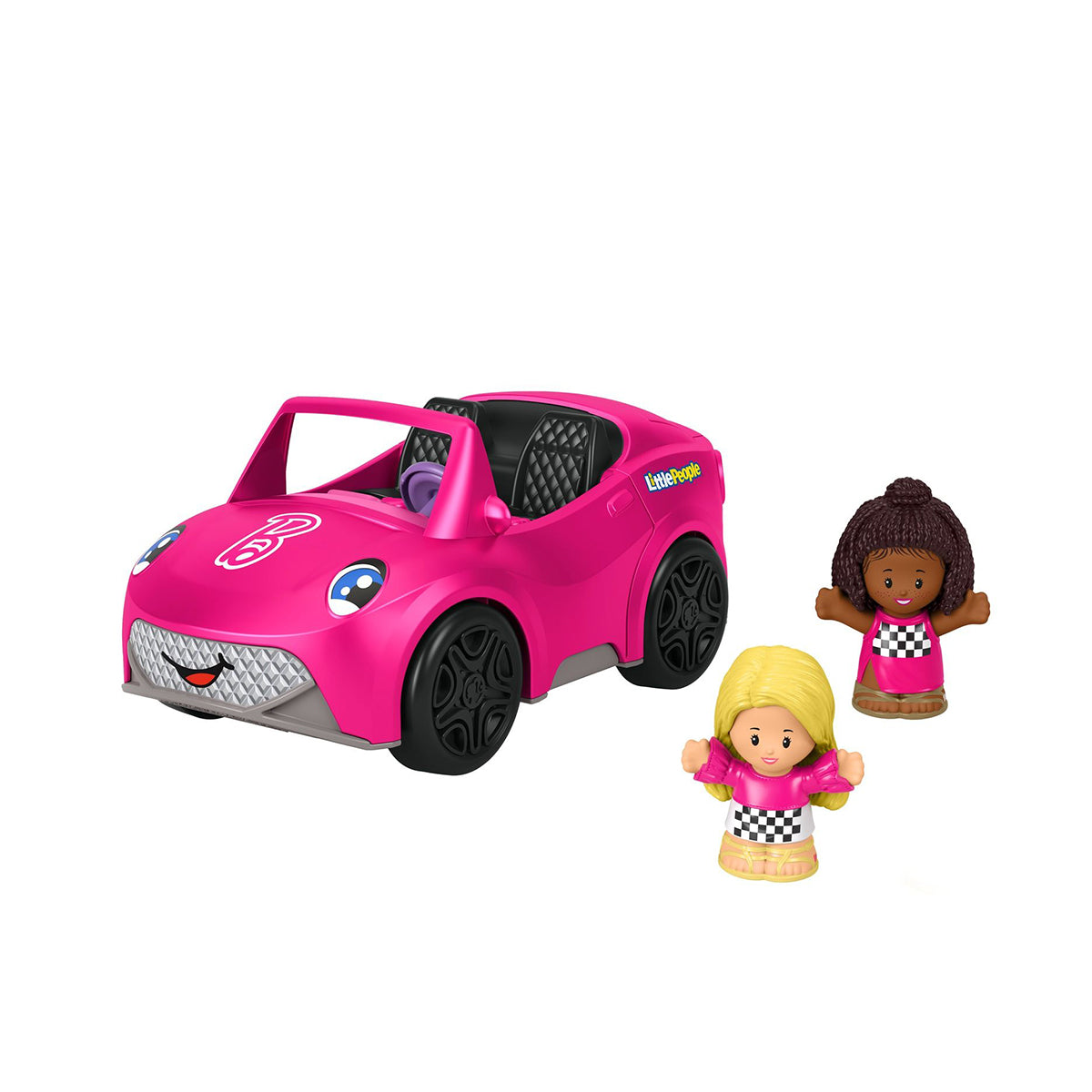 The classic Barbie convertible is brought down to Little People toy size for toddler-friendly pretend play with this adorable vehicle and figure set from Fisher-Price. When kids press one of the Little People figures into the car's driver's seat, they'll hear fun music and sounds. Sized just right for little hands, this push-along toy convertible seats both figures and features cool Barbie colors and graphics.