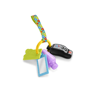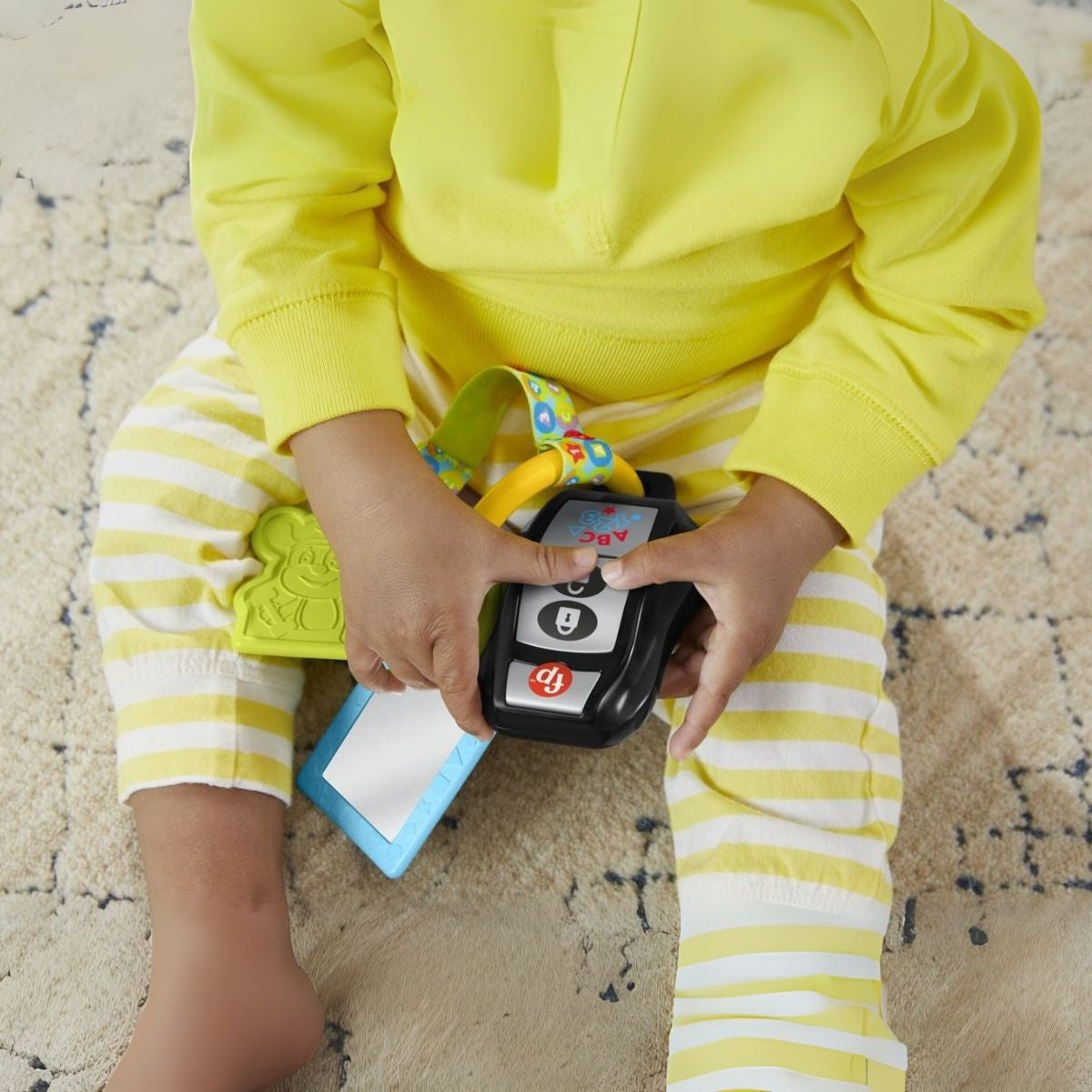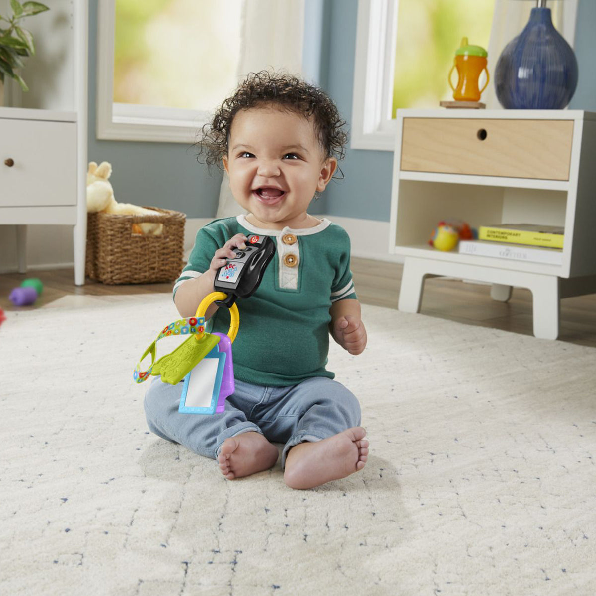 Baby is ready to hit the road on fun learning adventures with the Laugh & Learn Play & Go Activity Keys from Fisher-Price. This travel-themed baby and toddler toy features 4 engaging activities on one easy-to-grasp fabric lanyard, including a musical car key fob, a squishy “hand sanitizer” bottle, “photo frame” mirror, and “gym badge” teething toy. These toys help foster fine motor skills while introducing little ones to counting, cause & effect, and imaginative play. Use the globe button to select a language: English, German, or French