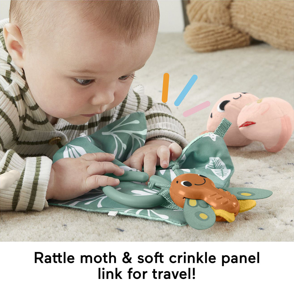 Moth and crinkle panel easily attach to a baby gym, diaper bag or stroller with a convenient link for travel use. Toy set comes in a giftable package perfect for a baby shower or sprinkle.