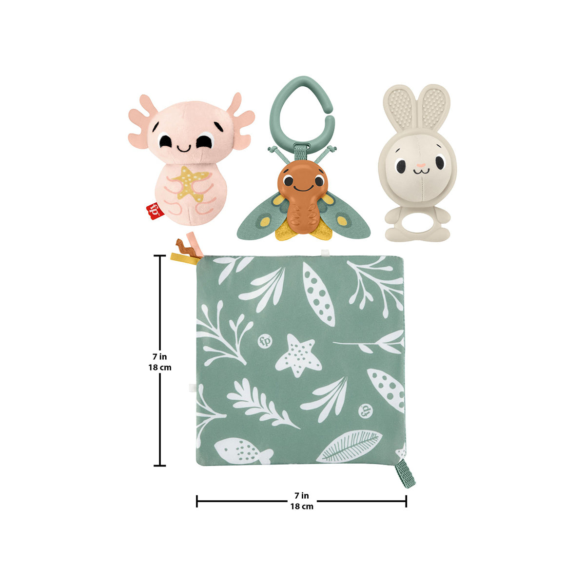 Features: Set of 4 baby toys to help foster newborn sensory development; giftable package is perfect for a baby shower or sprinkle BPA-free bunny teether has textured ears and removeable jingle ball for added fine motor play Plush axolotl features gentle chimes for auditory reward and cause & effect play Multi-textured moth rattle and fabric crinkle panel easily attach to baby gym, stroller or diaper bag with convenient loops for travel play Helps strengthen fine motor skills and engage the senses for newborns from birth & up Fisher Price So Many Senses Gift Set, 4 Baby Sensory Toys with Fine Motor Activities. Birth + Batteries not required
