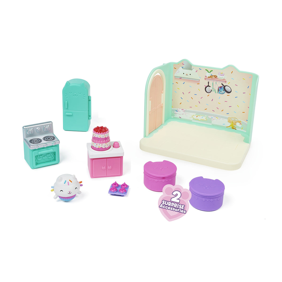 - Cakey Cat Sprinkle Cake playset with spinning cake, oven, and fridge