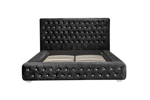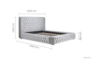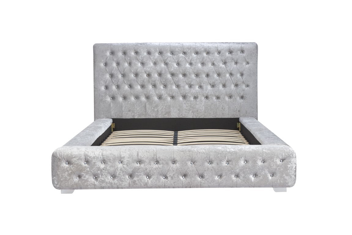 The Grande bed frame is upholstered in polyester with silver feet and comes in a beautiful crushed steel velvet.