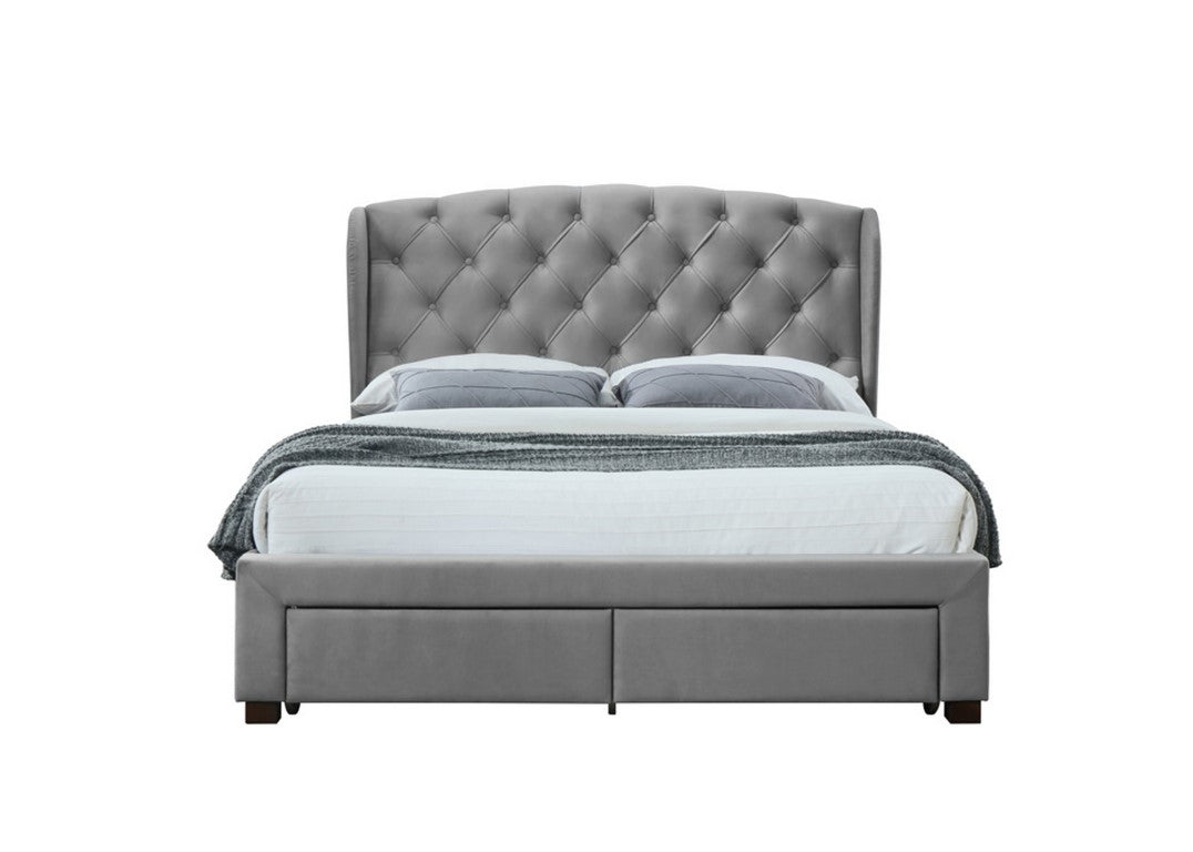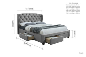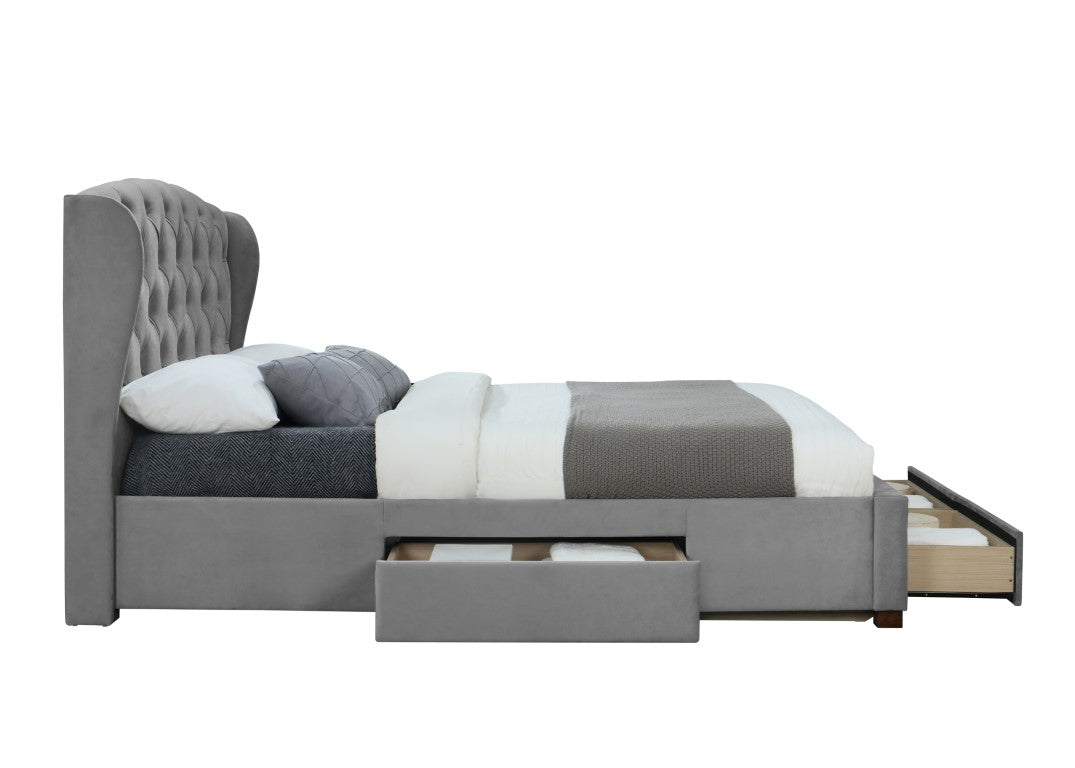 Make a grand style statement with this elegant and contemporary bed frame. Featuring a wingback headboard with tufted detailing and 4 drawers.