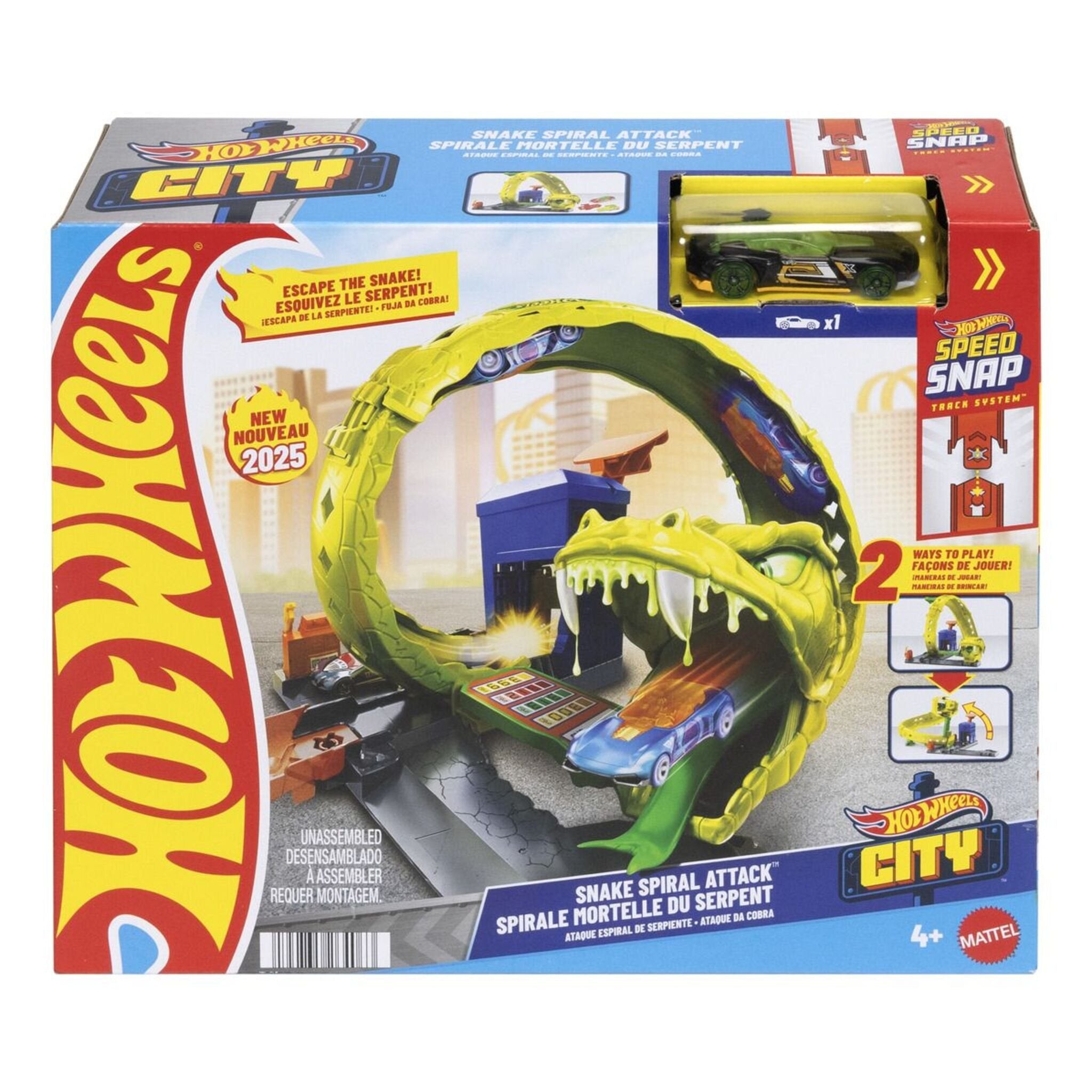 Race and stunt through the Hot Wheels Snake Spiral Attack Playset that features a massive snake nemesis and two ways to play! Drive onto the set and refuel at the gas pumps that have adjustable hoses, then head into the mini-mart that's also a covert launcher. Slam the launcher with enough power to send cars speeding through the snake's mouth and avoid getting trapped and eaten.