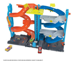 Experience epic 2-in-1 racing with the Hot Wheels City Transforming Race Tower. This innovative playset transforms from side-by-side competing tracks with fair-start gates to a single track that's more than 26' tall.