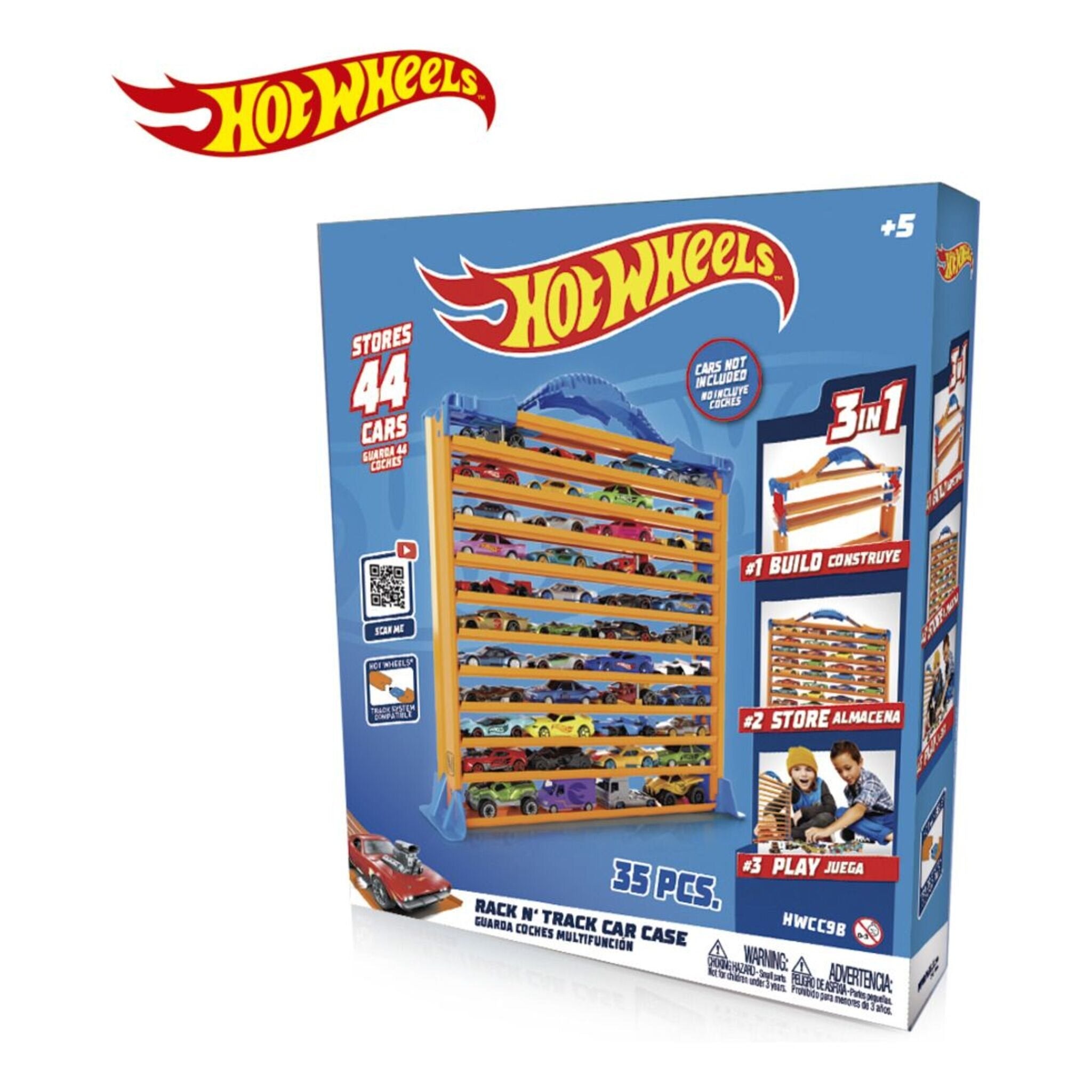 Hot Wheels Rack n' Track Car Case. Boost your creativity with a cool combination of Hot Wheels tracks for big customising fun and store up to 44 of your favourite cars Includes 4 track connectors: 13 regular tracks, 1 small track, 10 brackets, 2 ramps, 1 carry handle, 2 corners and 2 bases Connect to other Hot Wheels track sets (sold separately) for tons of exciting, stunting fun!