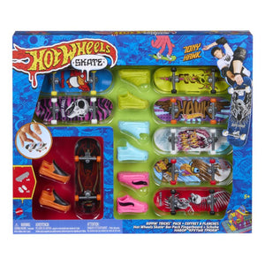 The Hot Wheels Skate Rippin' Tricks Pack includes an awesome mix of 8 fingerboards and 4 pairs of corresponding skate shoes with Tony Hawk-themed designs that fit every vibe. Each board comes fully assembled with cool decos and graphics and has a matching themed pair of removable skate shoes. Use the shoes to get a feel for the board when learning to blast ollies and boardslide. Colors and decorations may vary.