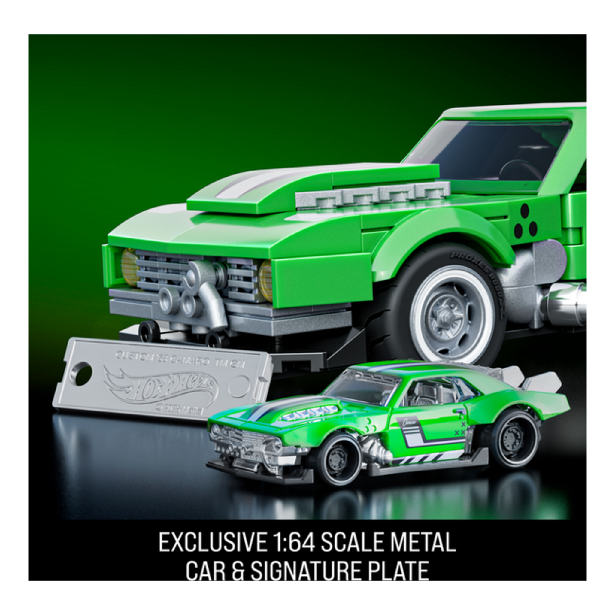 Shift into high gear with the buildable 1:32 scale Custom ’68 Camaro by Mattel Brick Shop. This detailed and authentic set includes decals for customization, a metal signature plate, plus an exclusive matching metal car. Collect all the cars in the Speed Series and build your collection.