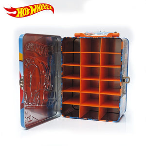 Rev up the fun with the Hot Wheels Tin Car Storage Case! Hot Wheels Tin Car Storage Cases are like pit stops for your miniature speedsters. This shiny metal box is filled with 18 compartments, ready to house your prized Hot Wheels collection. Keep 'em on display or take them on the go, for super fun racing sessions with your mates!