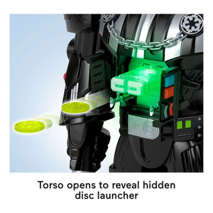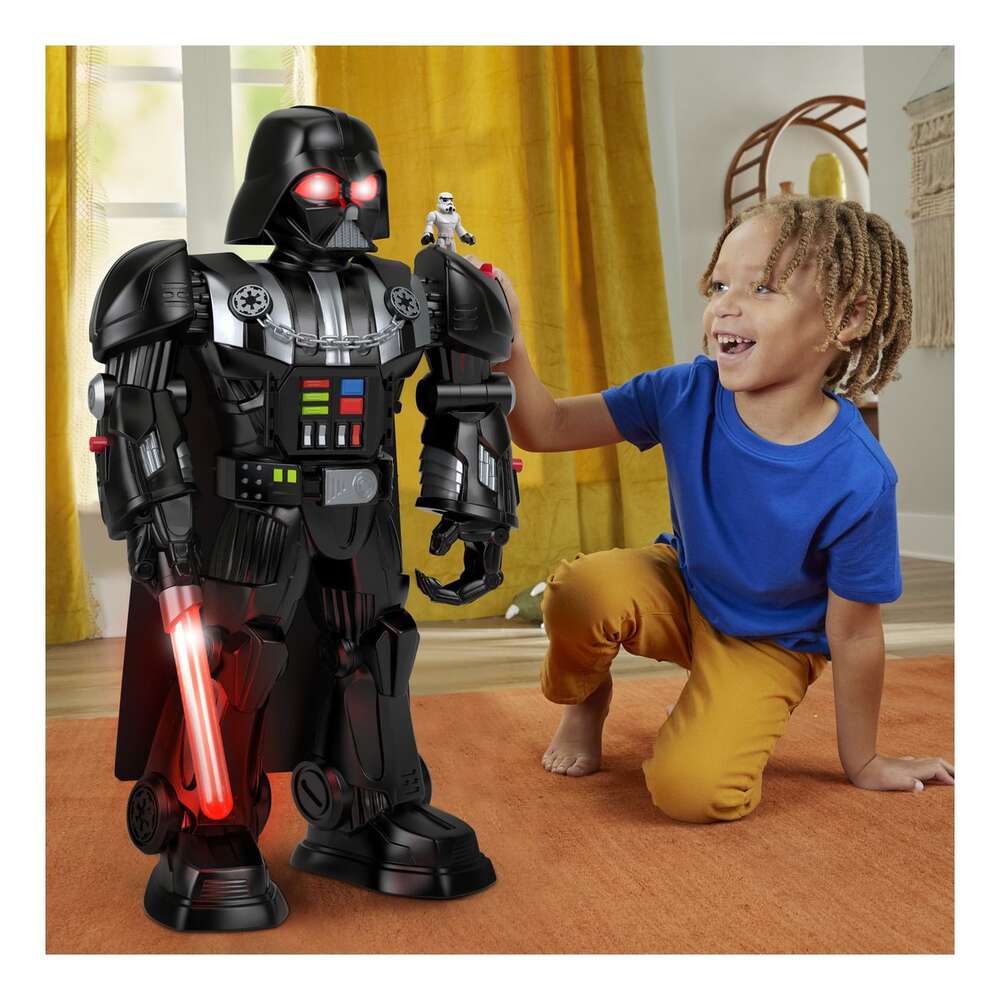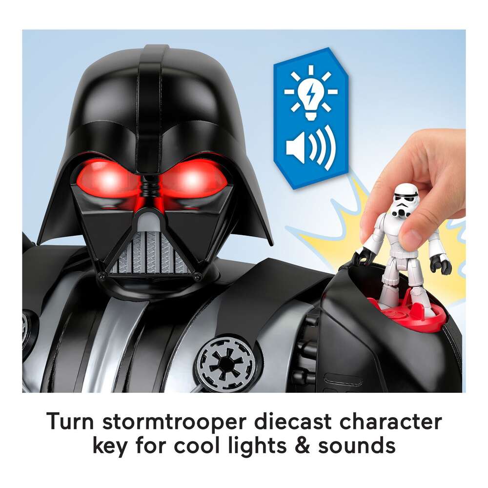 Young fans can bring the Galactic Empire’s most notorious military commander to life with awesome action-packed pretend play with the Imaginext STAR WARS Darth Vader Bot from Fisher-Price. Towering at over 2 feet tall, this interactive Darth Vader robot is packed with kid-controlled action, including a pop-out disc launcher, extendable Lightsaber accessory and a Force-inspired ball launcher, plus cool lights and familiar character sounds. Kids will love creating their own intergalactic adventures with this iconic STAR WARS villain. Includes 3-inch stormtrooper diecast character key toy and 7 projectiles for storytelling play. Requires 4 AA (LR6) alkaline batteries. Colors and decorations may vary.