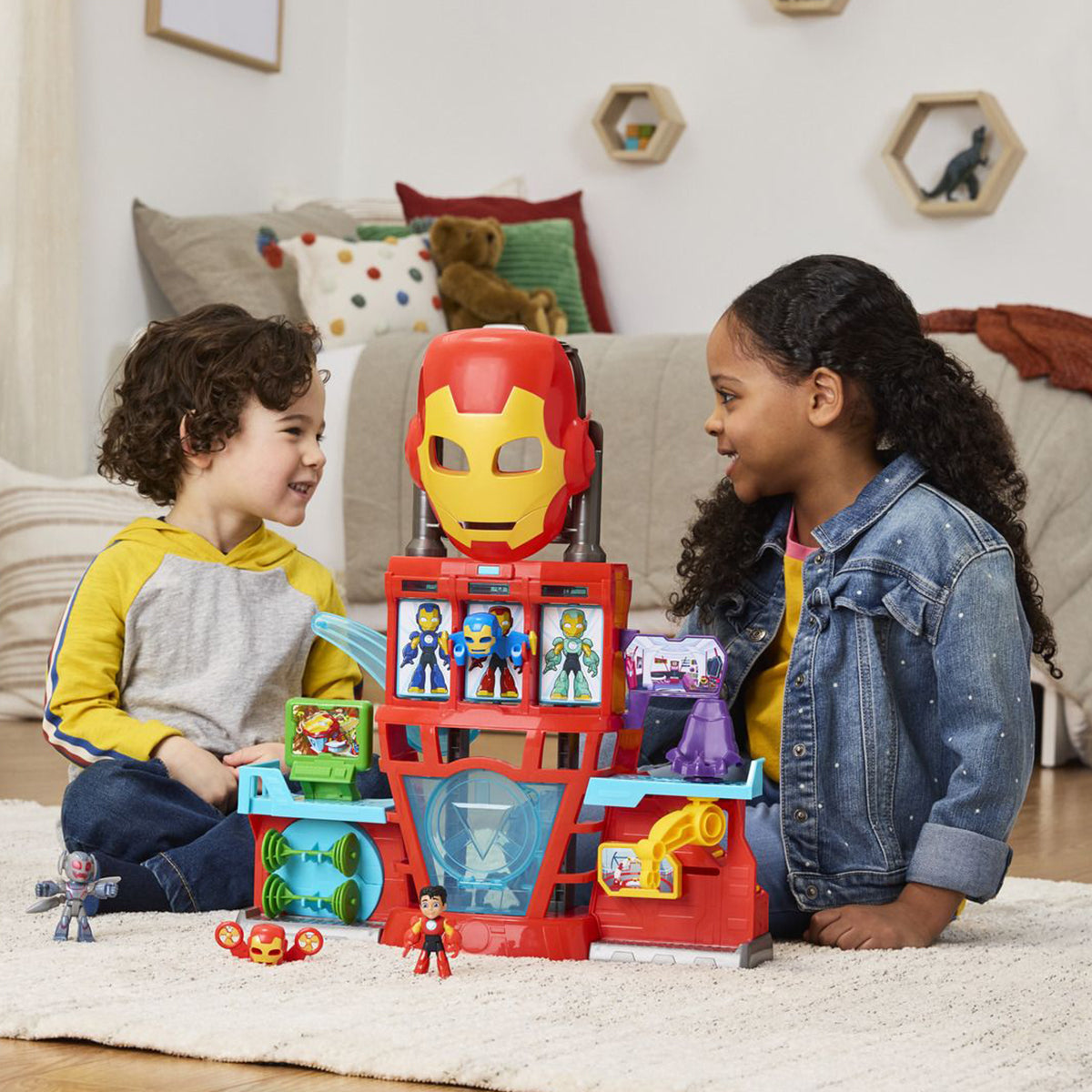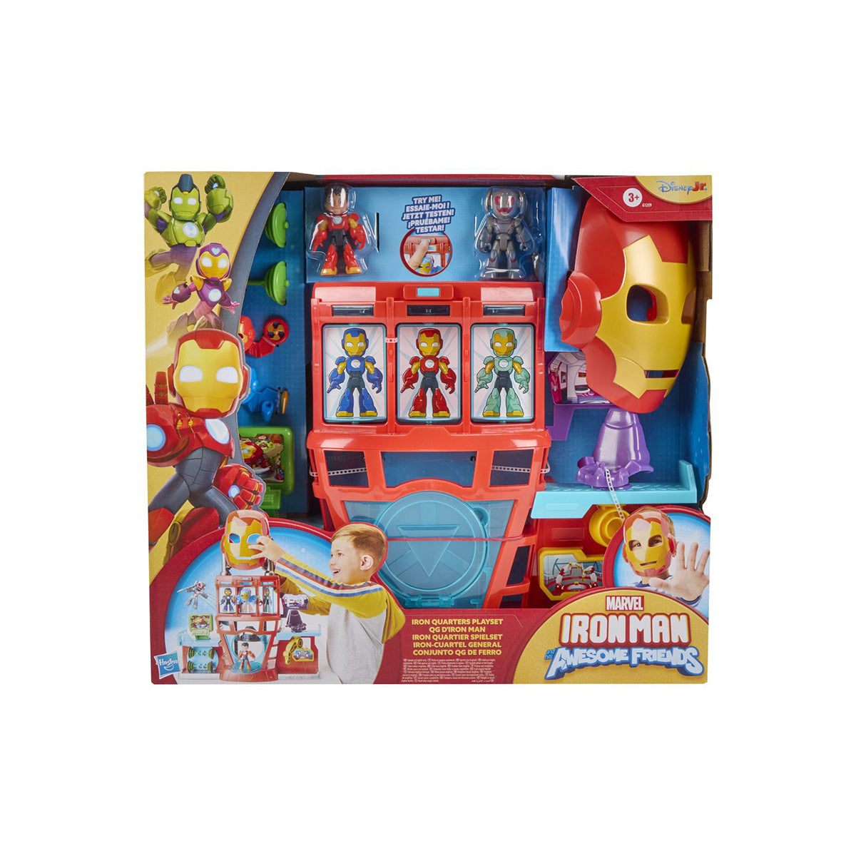 Imagine armoring up and blasting into action alongside Iron Man with the Iron Man and his Awesome Friends Iron Quarters Playset! This 2-in-1 Marvel toy set features a removable Iron Man role play mask for kids ages 3 and up, they can wear while pretending to save the day!