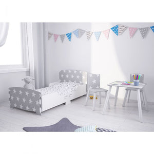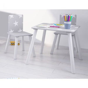 Kidsaw star table & chair set is perfect for little children and great for creative play. A little table and 2 little chairs for them to play at. The table and chairs come in a white and grey with white stars design giving this a contemporary/trendy/nordic feel. The set is made from MDF and solid wood material.