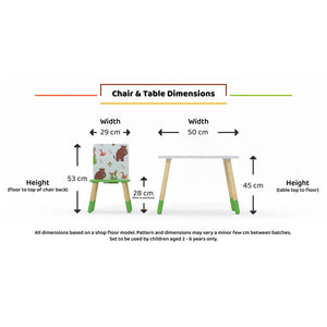 Oh help, Oh no, Its a Gruffalo, This table & 2 chairs is for kids who love to play, read or draw. Featuring high-quality graphics that mimic Julia Donaldsons and Axel Schefflers The Gruffalo story perfectly. All the characters from the book are included, All the Gruffalo characters make up this set. This table & chair set would fit perfectly in a Gruffalo or forest-themed bedroom or playroom or simply anywhere your child wants to play. Very easy to assemble, the legs simply screw into the brackets pre-fixed beneath the table top and seat bases. Made using FSC material. Made with a new Scandi design showing pine wooden legs dipped in paint on the ends.