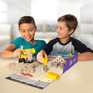 The Dig & Demolish box even opens up into an enclosed construction play space. When you’re finished playing, pack everything away inside the box until next time for easy storage. Let Kinetic Sand flow through your hands – it’s so satisfying, you won’t be able to put it down! Kinetic Sand is made from natural sand and is wheat, gluten and casein free. This construction-themed Kinetic Sand sensory toy is perfect for kids ages 3 and up. Create with the Kinetic Sand Dig & Demolish Set again and again and have hours of construction fun!