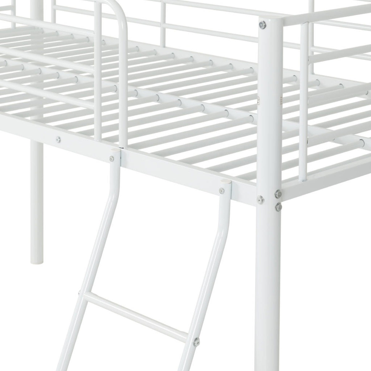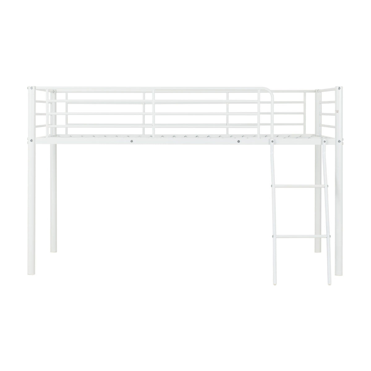 Kora Mid Sleeper Bed Frame. Offering a practical sleeping solution for both children and spare rooms, this bunk bed is simple yet effective. A metal frame offers a sturdy structure, perfect for children’s rooms. Finished in white, black or silver, this bunk bed will seamlessly fit into any interior. This entry level bunk bed has a clean, universal design as well as metal slats to support sleep. Delivered in 1 box, this item is easy to assemble and is perfect for those on a budget.