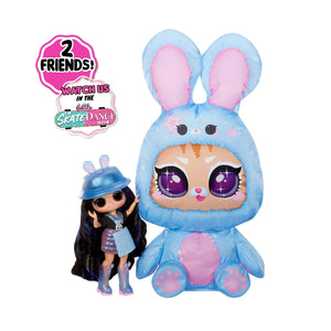But wait, the surprise doesn’t stop there! Undo the velcro from the back of the bunny’s head to unveil your gorgeous Tweens Aya Cherry doll hidden inside! Don’t forget to unbox the unique surprises and remove the Tweens doll from her doll stand to dress her in trendy new fashions and accessories including a fashionable skirt, stylish hat with bunny ears to match her huggable costume, chic shoes, and cute bow collar!