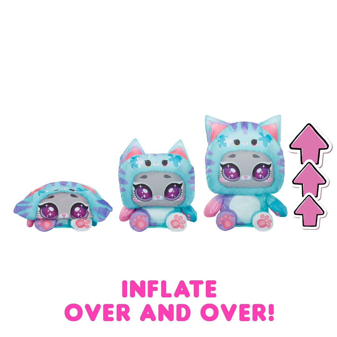 Discover what’s inside by first tearing the zipper at the bottom of the packaging and lifting up the outer pink shell to reveal a mystery wrapping paper, kicking off the first stage of the inflating process! Watch as the paper grows bigger and fuller and once completely inflated, rip open the paper to discover your charming teal kitty costume! But wait, the surprise doesn’t stop there! Undo the velcro from the back of the kitty’s head to unveil your gorgeous Tweens Emma Emo doll hidden inside!