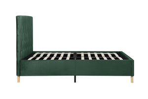 The Loxley bed frame is upholstered in polyester with complementary light feet and is available in mustard, grey, green and blue.