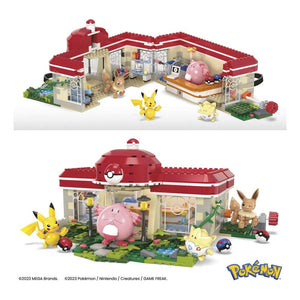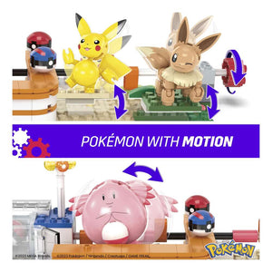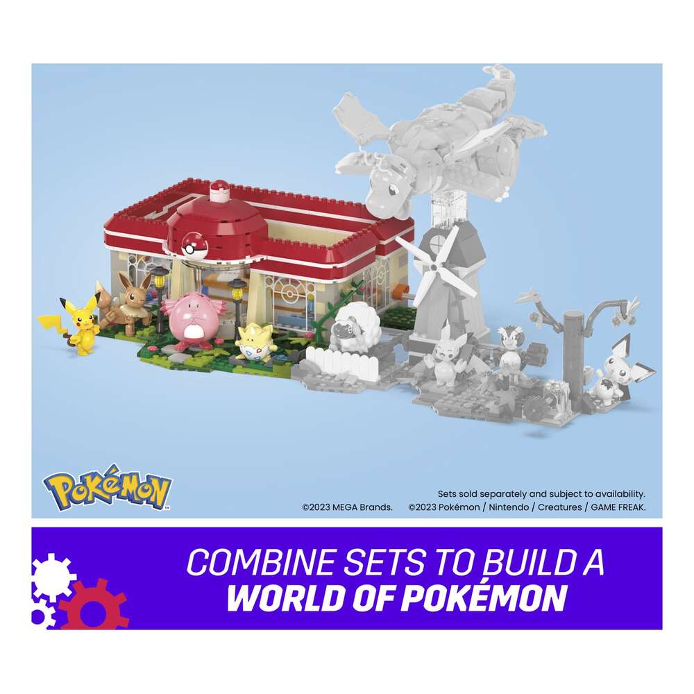 Welcome to the Pokemon Center! This iconic location is now a buildable set featuring four familiar faces: Pikachu, Chansey, Eevee, and Togepi. Turn the crank to see Chansey dancing, Pikachu and Eevee playing peek-a-boo, and Togepi opening the door. Combine with other Adventure Builder sets to create an expanded Pokemon world with motion; each sold separately.